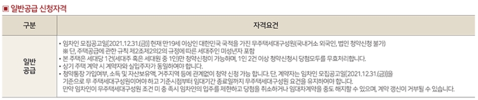 공 통 | 최초 입주자 모집공고일(21.12.31일) 현재 ㅇ 현재 대한민국 국적을 가진 만19세이상인자(무주택세대구성원일것) ㅇ 세대당 1건(세대주 혹은 세대원중 1인만가능) ㅇ 청약통장 가입여부, 소득 및 자산 보유액, 거주지역등 관계없이 청약가능 |